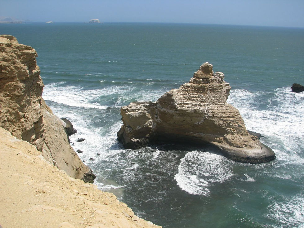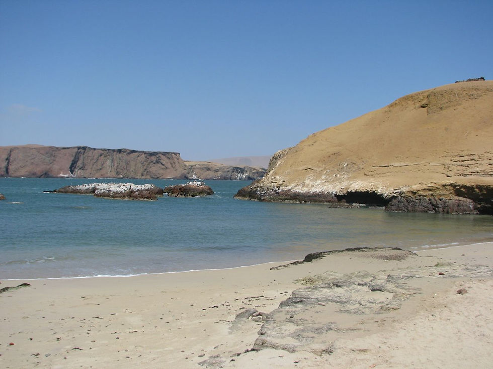 ' s Middags nam ik de eerste bus richting Huaraz. Tijd zat dus om rustig in te pakken en nog een uitstap te doen naar het natuurreservaat van Paracas. Het gebied is vooral gekend voor de vele vogels, zoals flamingo's (de we in de verte zagen) en pelikanen, en de uitzonderlijk mooie kustlijn. Naast grillige rotsformaties heb je er bv. ook een strand met rood zand. Het was plezant om uit te waaien aan de zee en de vertrekkende vissersboten uit te zwaaien.